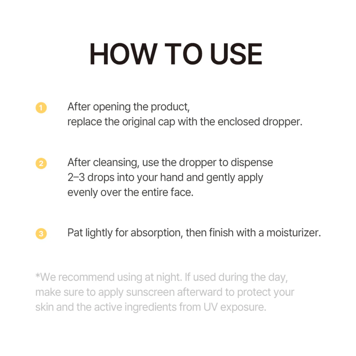 • Apply 2-3 drops on clean skin and gently massage to aid absorption. If used in daytime, follow up with sunscreen.